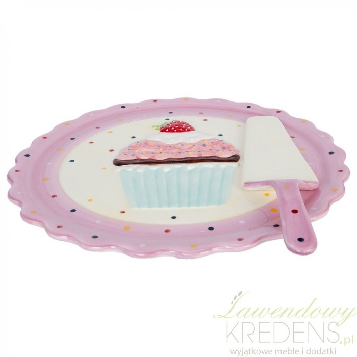 Płaska patera ceramiczna z falowaną krawędzią to jeden z dodatków, który nie pozostanie nie zauważony na przyjęciu, które urządzasz. Patera na tort w zestawie z łopatką posiada bajkowy wzór z różowym i kremowym kolorem oraz babeczkę z wisienką. To doskonały wybór jeśli chcesz aby twoje przyjęcie było inne niż wszystkie. Patera na ciasto od Clayre&Eef to naczynie, którego pozazdrości Ci każdy!