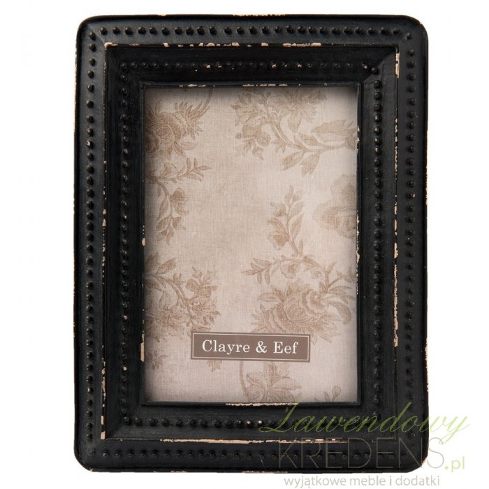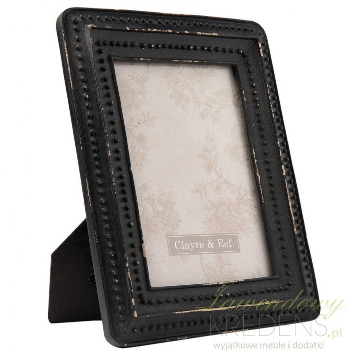 Ramka na zdjęcie firmy Clayre & Eef ma czarny przecierany kolor i prostokątny kształt. Posiada wspaniałą dekorację w formie ozdobnych wypukłych koralików. Wygląda na nieco starą i zniszczoną, co jest jej niebywałą wartością. Ramki na zdjęcia to fantastyczna ozdoba ściany czy komody.