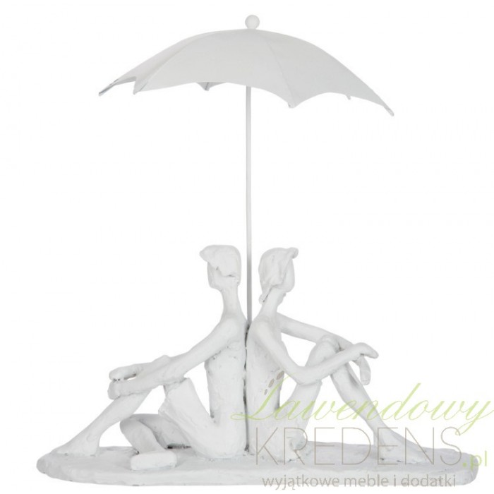 Figurka ozdobna w białym kolorze świetnie zaprezentuje się na jednej półek w regale lub witrynie. Figurka przedstawia parę zakochanych pod rozłożonym parasolem. Para na owalnej podstawie to kobieta i mężczyzna patrzący w te samą stronę. Artykuły dekoracyjne w białym kolorze to sposób na zachowanie dobrego stylu we wnętrzu przez długie lata.