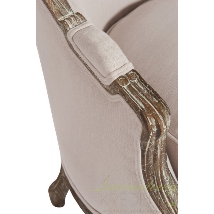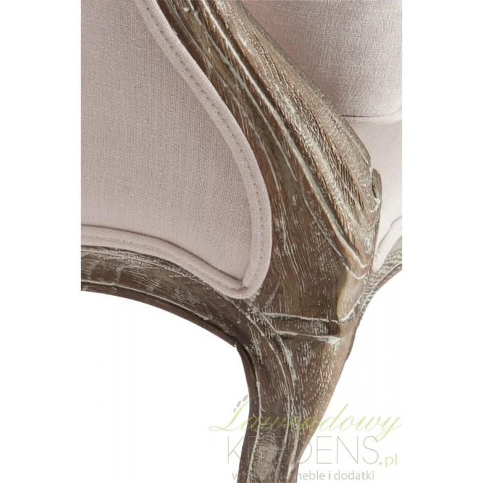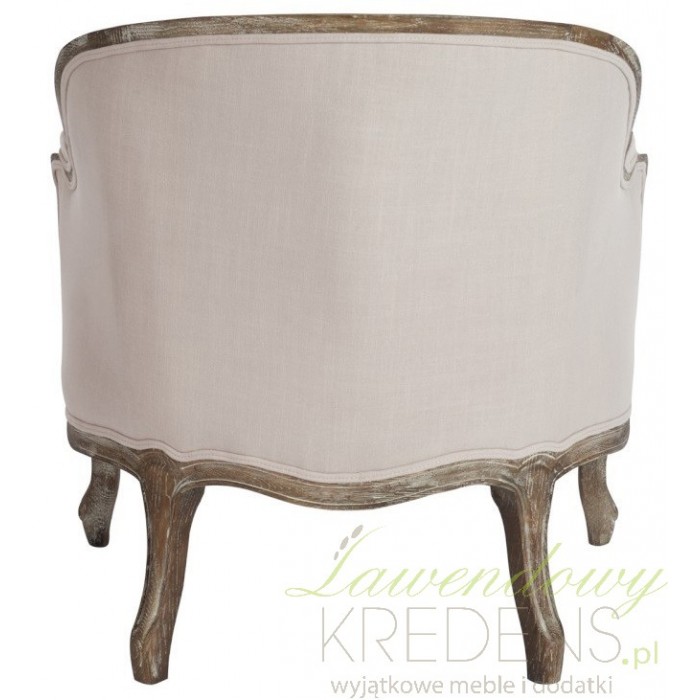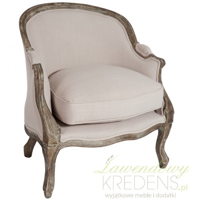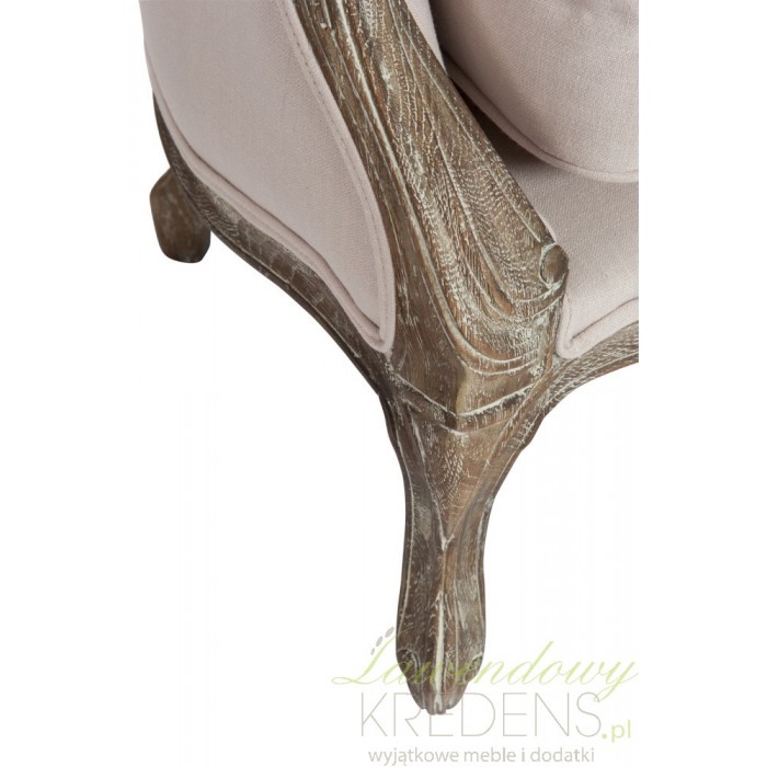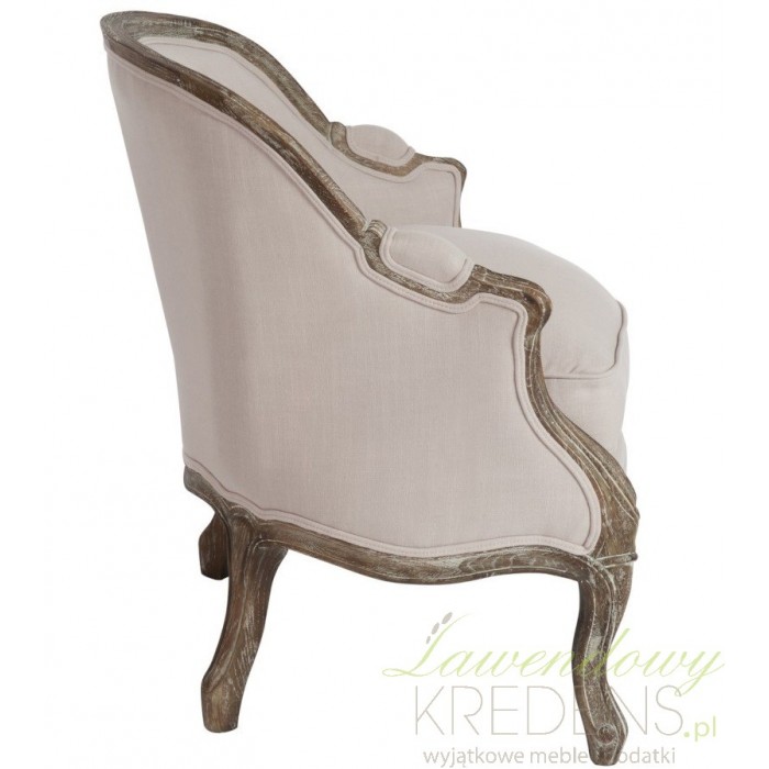 Fotel prowansalski wykonany z solidnego drewna dębowego, którego kształt dopracowany został w każdym calu. Kształt drewnianej ramy fotela jest przepięknie rzeźbiony, a jego powierzchnia stylowo bielona. Tapicerka fotela to natomiast wytrzymała, bawełniano-lniana tkanina o ciepłej, kremowej barwie. Tapicerka pojawia się także na bokach fotela co umożliwia wygodne oparcie na nich łokci.