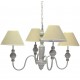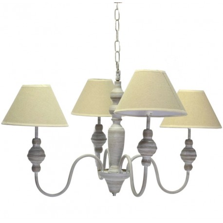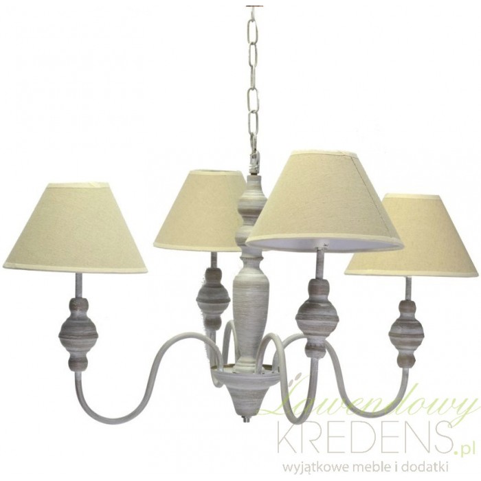 Żyrandol w stylu prowansalskim to metalowy żyrandol z bezowymi abażurami. Cztery źródła światła ukryte pod prostymi abażurami zapewnią optymalne oświetlenie salonu lub jadalni. Żyrandol prowansalski z przecierkami na giętych ramionach został wykonany w duchu słonecznej Prowansji. Prowansalskie żyrandole do zamocowania na łańcuchu, dzięki możliwości jego skracania możesz zawiesić na dowolnej wysokości.