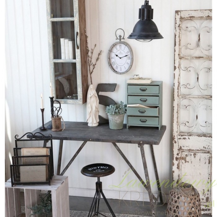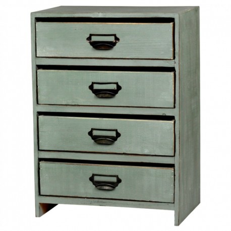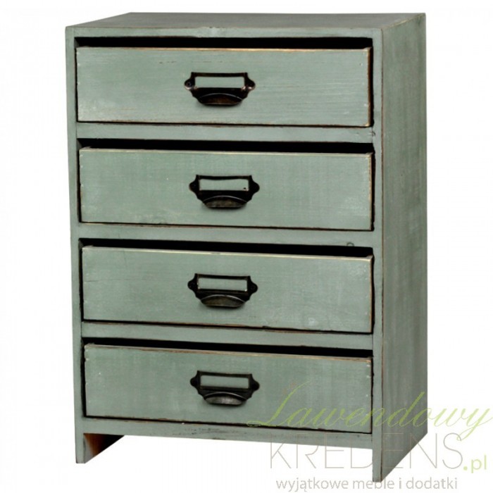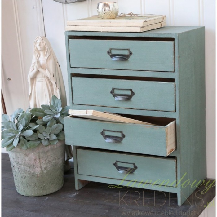 Zielona szafeczka na biurko ma cztery małe szufladki z metalowymi gałkami. Każda z nich może służyć przechowywaniu różnych przedmiotów. Marka Chic Antique zadba nie tylko o wygląd twojego wnętrza ale również o jego funkcjonalność. Serdecznie polecamy dodatki do aranżacji takie jak kolorowe szafeczki.
