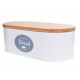 Metalowy chlebak w białym kolorze z owalną przykrywką do wykorzystania jako deska do krojenia.