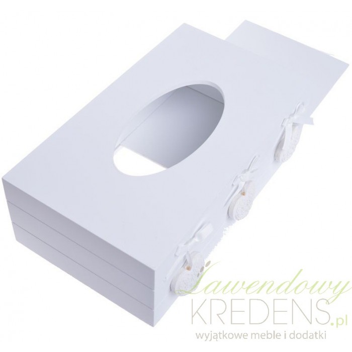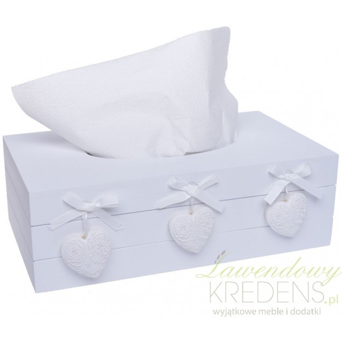 Białe pudełko na chusteczki w prowansalskim stylu dodatkowo ozdobione trzema uroczymi serduszkami z kokardkami.