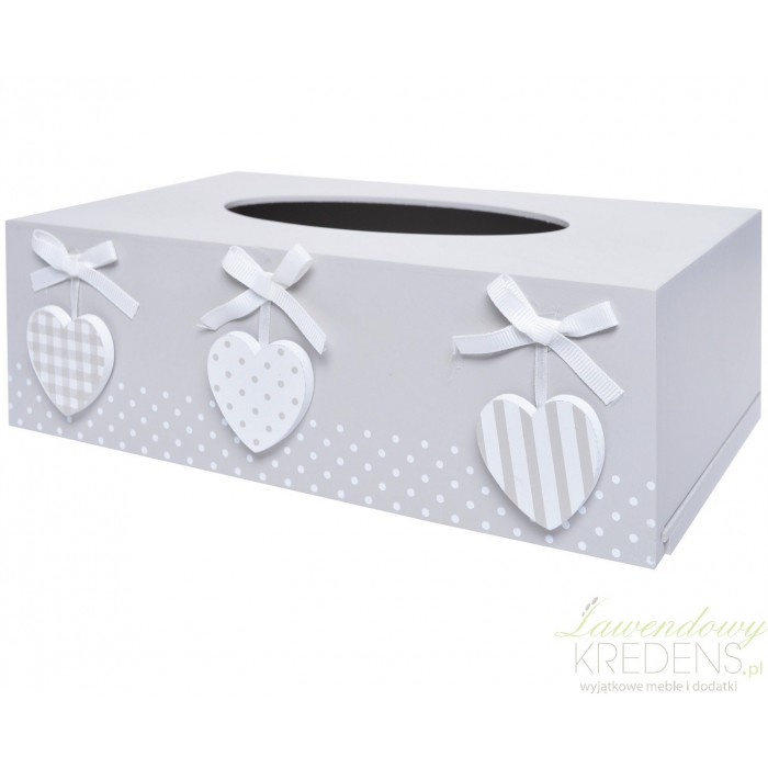 Szare pudełko na chusteczki, na którym widoczne są u dołu białe kropeczki. Pudełka na chusteczki o pięknych prowansalskich ozdobach jakimi są serduszka będą lepszą dekoracją niż paczki chusteczek ze sklepu. Dodatki w stylu prowansalskim przykuwają uwagę, ponieważ są piękne i funkcjonalne.