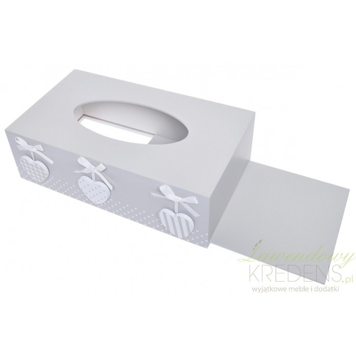 Pudełko na chusteczki w szarej kolorystyce ozdobione został trzema białymi serduszkami z różnymi wzorami. A dla nas będą one niezwykle praktyczną dekoracją.