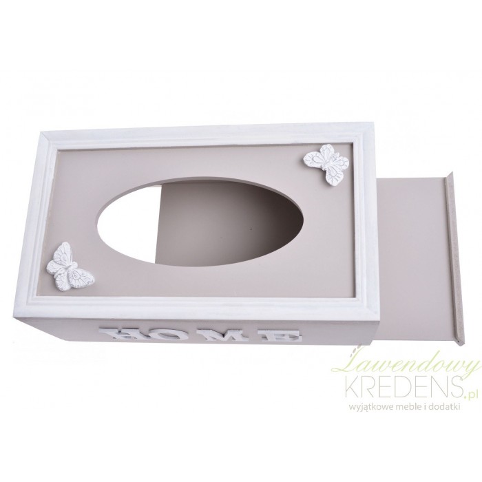 Prowansalskie pudełko na chusteczki w beżowym kolorze. Ranty pudełka mają kolor biały, a na wieczku pudełka znajdują się dwa wypukłe motylki. Bok pudełka jest natomiast ozdobiony białym, również wypukłym napisem HOME. Aby otworzyć pudełko i włożyć do niego tekturowe opakowanie z chusteczkami wystarczy przesunąć i wyjąć dno pudełka.