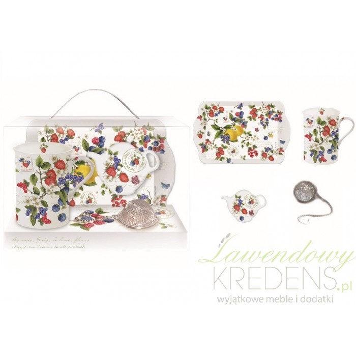 Zestaw prezentowy czyli zestaw do herbaty składa się z czterech niezwykle przydatnych elementów. Są to kubek, taca pokrywka i zaparzacz. Wszystkie są w cudownych żywych kolorach i zdobią je wspaniałe czerwono fioletowe owoce. To fantastyczny i bardzo ozdobny zestaw do kuchni.