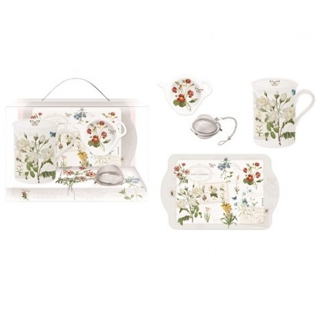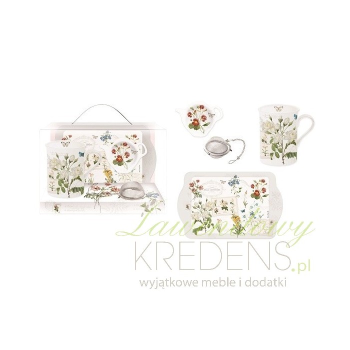 Zestaw do herbaty jest wykończony przepiękną grafiką z zielonymi roślinami oraz kwiatami. Zestaw do herbaty składa się z kubka, zaparzacza, tacki oraz okapki na torebkę z herbatą. Piękny wzór prowansalskich kwiatów wzbogaci kuchnie lub jadalnię o zupełnie nowe doznania i pozwoli ci doświadczyć spokojnej i relaksującej atmosfery. Wszystkie elementy, dzięki odpowiedniemu opakowaniu możesz także wykorzystać jako zestaw prezentowy.