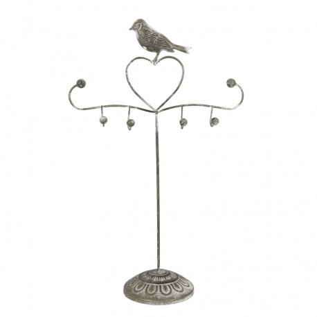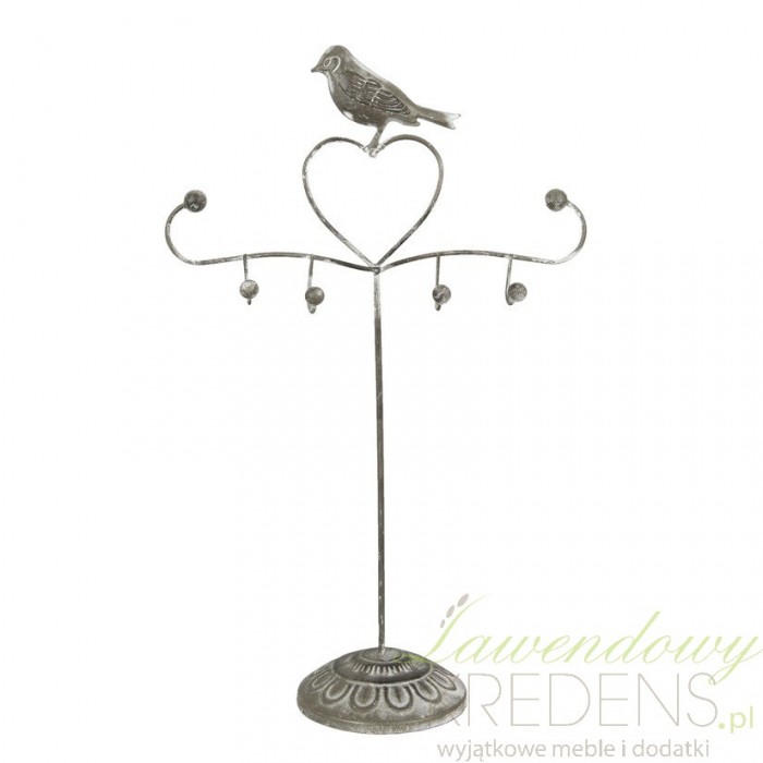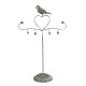 Stojak na biżuterię w szarym kolorze z bieleniami jest wykonany w całości z metalu. Na zakończeniu stojaka znajduje się otwarte serce z dekoracyjnym ptaszkiem. Pod sercem rozchodzą się na boki dwa cienkie drążki z haczykami. Dodatki do domu takiej jak stojaki na biżuterię z stabilną podstawą sprawdzą się jako element wyposażenia toaletki lub półki w łazience.