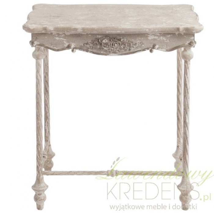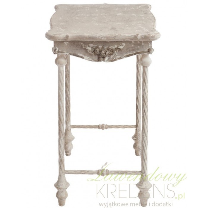 Jeśli podobają Ci się meble postarzane o niesztampowej stylistyce i potrzebujesz prowansalskiegi stolika to mamy coś dla Ciebie! Oto piękny stolik o wysokości 64cm, który można na przykład ustawić jako stolik kawowy przy sofie lub fotelu czy też stolik boczny w salonie. Kolorystyka stolika ma ciepły, beżowo-kremowy odcień. Na uwagę zasługuje nietylko oryginalne wybarwienie, ale także ciekawy kształt nóżek oraz wypukłe dekory w kształcie róż.