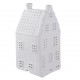 Biała lampka dziecięca wykonana została w kształcie wysokiego domku z otwartymi okiennicami.