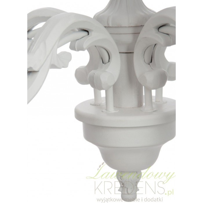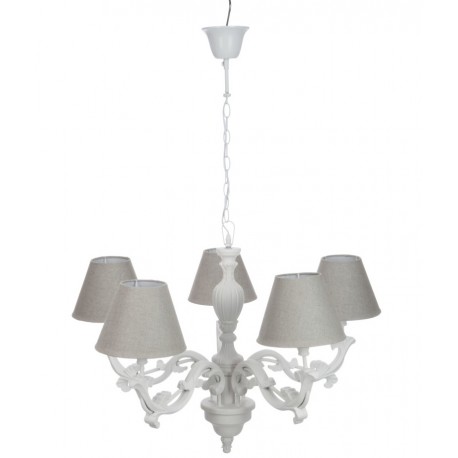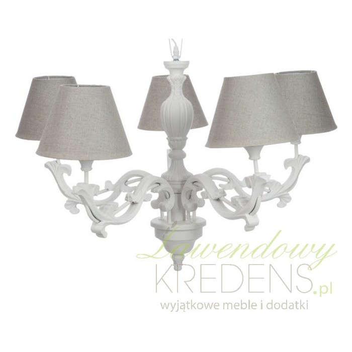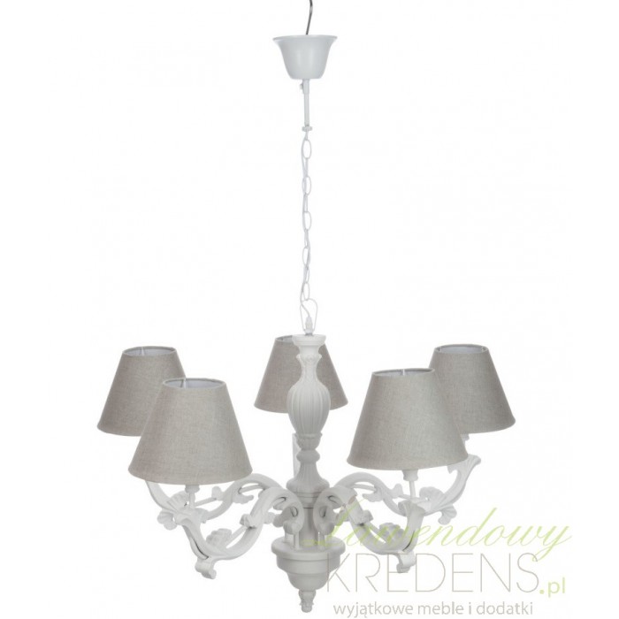 Biało-szary żyrandol prowansalski jest zawieszony na długim łańcuchu i ma aż pięć źródeł światła!