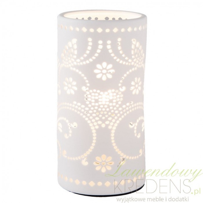 Lampka dziecięca z przepięknym wzorem kwiatów i wygiętej łodygi ma biały kolor. Wzór na lampie jest wykonany za pomocą drobnych otworów, dzięki którym równiez światło żarówki rozprasza się w wyjątowy sposób. Taka lampka ceramiczna może zdobić także elegancką sypialnię. Gorąco polecamy śliczne lampki dziecięce z azurowymi wzorkami.