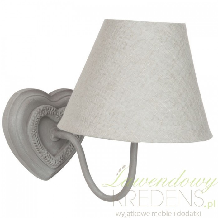 Kinkiet prowansalski w szarym kolorze z ozdobnym kształtem serca i wyjątkowym abażurem.