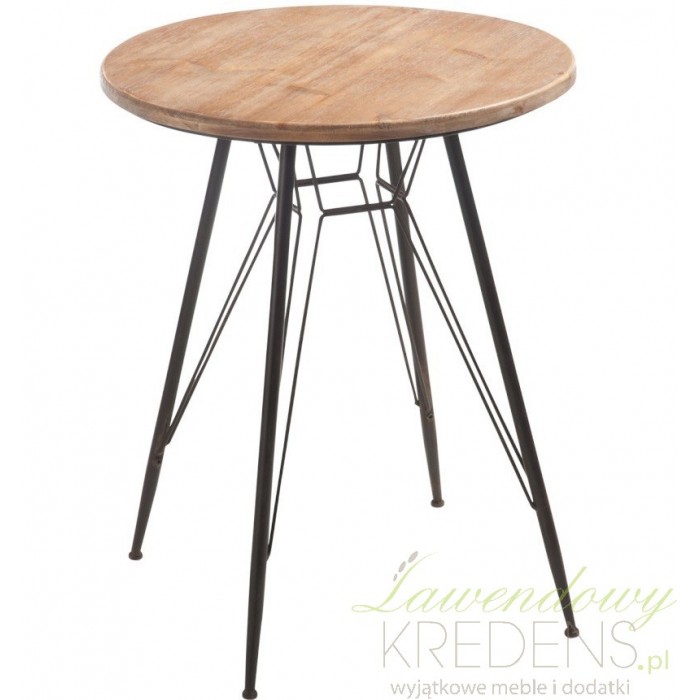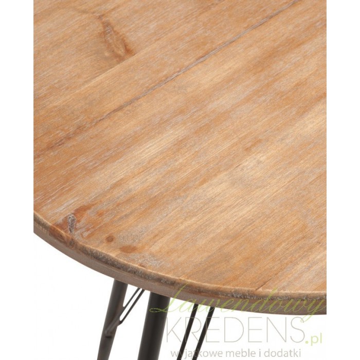 Okragły stół loftowy z drewnianym blatem z solidnie wzmocnioną nogą poprzez metalowe pręty.