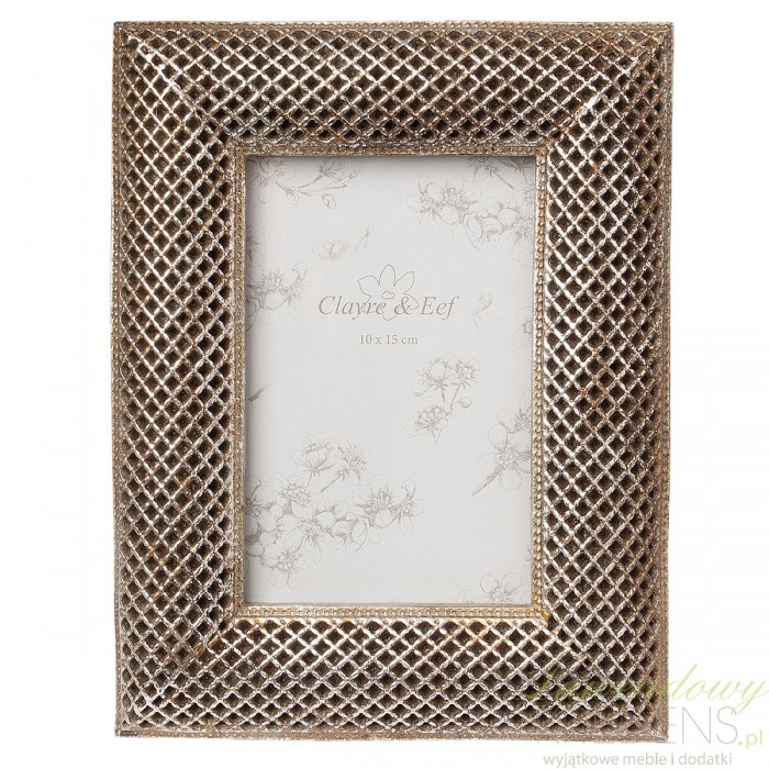 Prostokątna ramka na zdjęcia jest stojąca i otoczona siateczką w złotym kolorze.