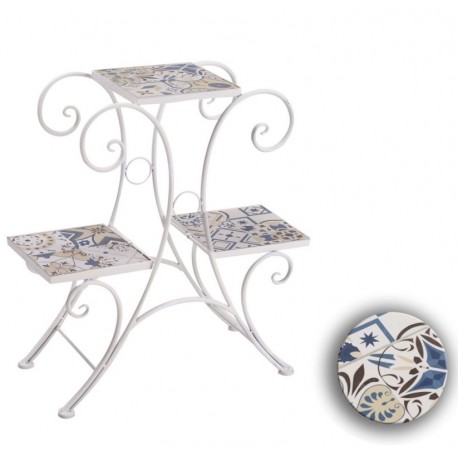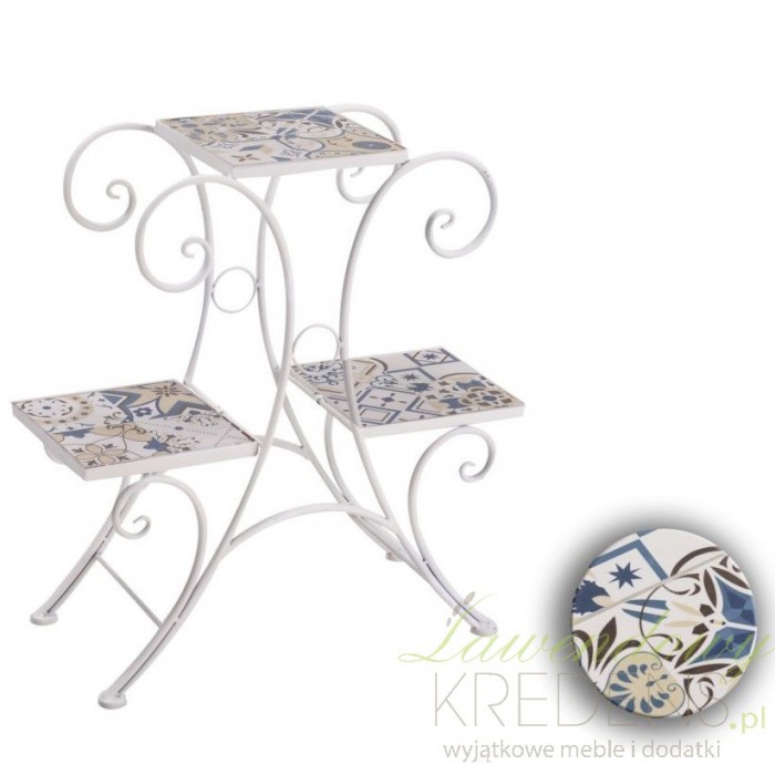 Stojak na kwiaty wykonano montując do metalowego stelaża trzy kwadratowe płyty z wzorkami. Na każdej z płyt znajduje się etniczny i kolorowy wzór. Kwietnik metalowy jest malowany na biało, dzięki czemu tworzy z kolorowymi podstawkami na donicę spójną całość. Kwietniki ozdobne wybierz dla urody balkonu lub do ogrodu.