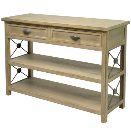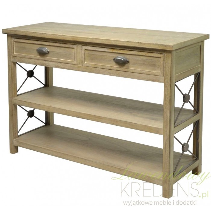Konsola prowansalska z charakterystycznie wykończonymi bokami. Na bokach mebla pomiędzy półkami wstawiono drewniane pręty wzmacniające cały mebel i podkreślające styl prowansalski. Konsola w stylu prowansalskim z półkami jest szeroka i posiada dwie pojemne szuflady zaopatrzone w metalowe uchwyty. Brązowe meble prowansalskie to praktyczne i modne rozwiązanie.