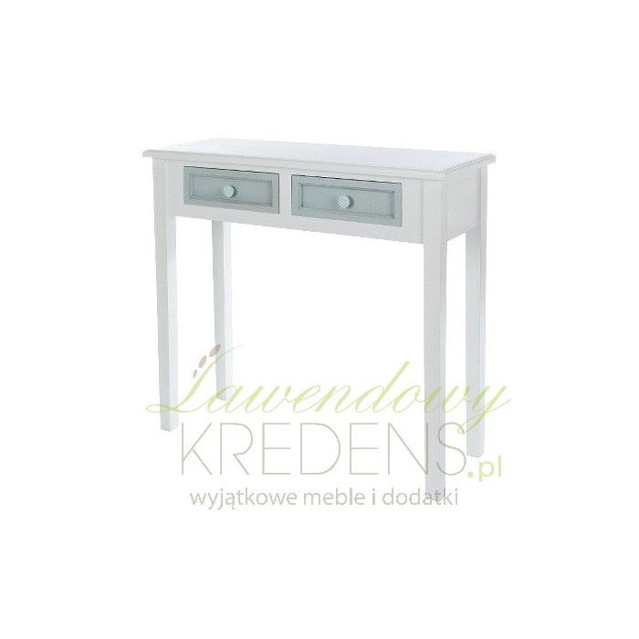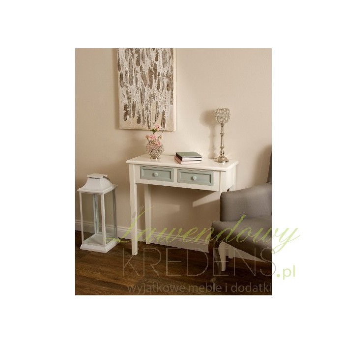 Konsola prowansalska z kolekcji Laguni to biały mebel cudnie kontrastujący z dwoma szufladami w kolorze zielonoszarym. Szufladki umieszczone pod blatem sprawiają, że konsola prowansalska może być wykorzystana także jako biurko. To propozycja nie do odrzucenia dla osób, którym podobają się oryginalne i niespotykane meble. Wybierając meble w stylu prowansalskim takie jak biała konsola z prostymi nogami, stajesz się właścicielem niepowtarzalnie urządzonego wnętrza.