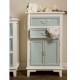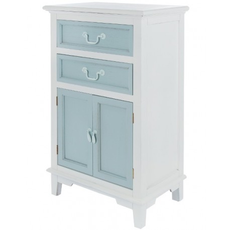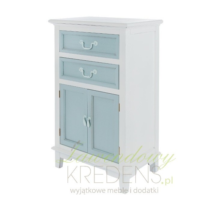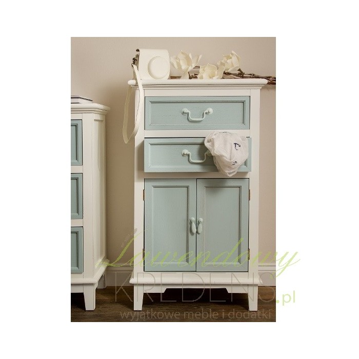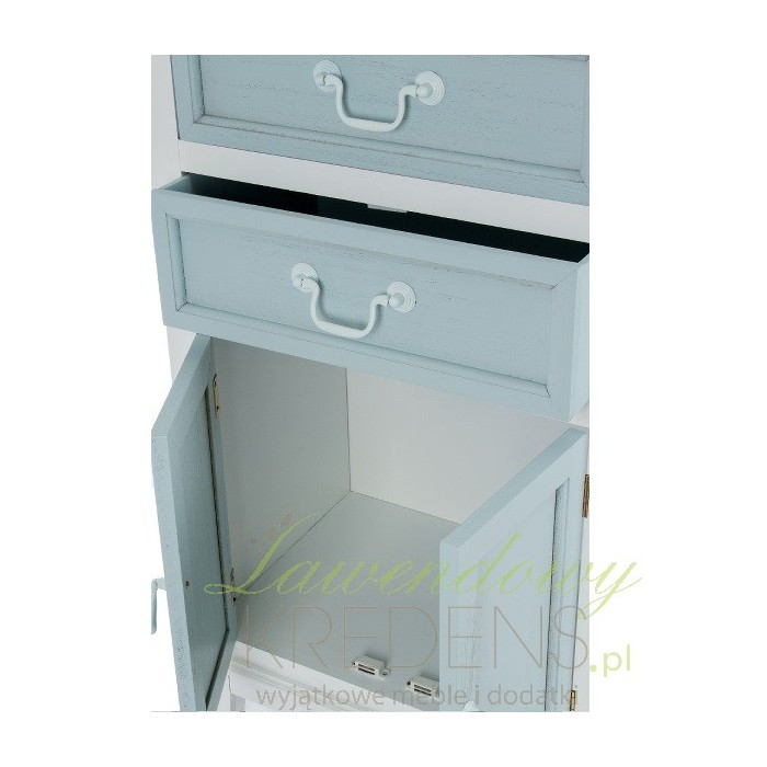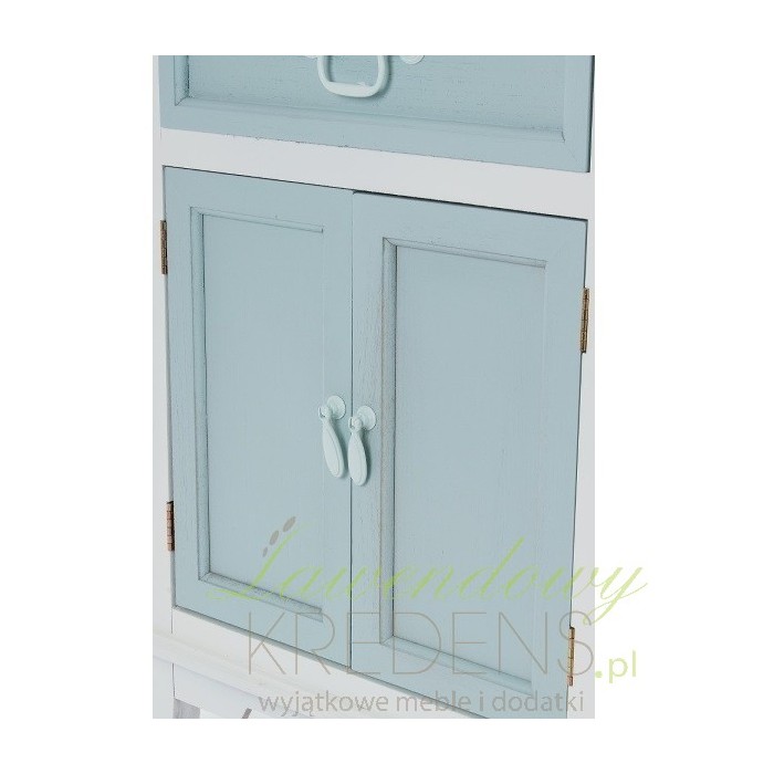 Komoda w stylu prowansalskim wyposażona w szufladki i szafkę może okazać się odpowiednim rozwiązaniem w każdym z Twoich wnętrz. To co potrzebne schowasz w blękitnozielonoszarych szufladach lub w zamykanej dwoma skrzydłami szafce. Mebel jest ustawiony na krótkich nóżkach i poza szufladami ma kolor biały. Postaw na oryginalność i dbałość wykonania czyli na meble w stylu prowansalskim.