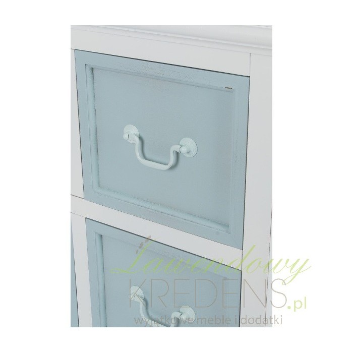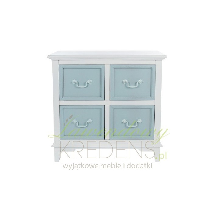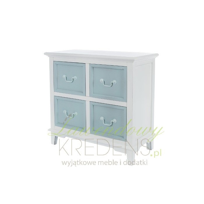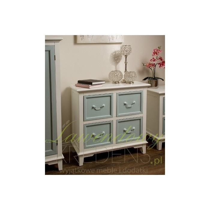 Komoda prowansalska ma bardzo prosty kształt i cztery szuflady w dwóch rzędach. Do każdej z szufladek zamocowano prosty uchwyt. Stylowa komoda w stylu prowansalskim z kolekcji Laguni to mebel, do któergo z powodzeniem dopasujesz inne meble z tej kolekcji i stworzysz jednolitą aranżacje sypialni lub pokoju dziennego. Z miłości do świata Prowansji polecamy meble w stylu prowansalskim.