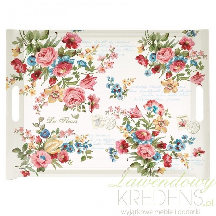 Przepiękna taca prowansalska, ozdobiona kolorowymi kwiatami i napisami w języku francuskim, wykonana została z nietłukącego się tworzywa.