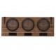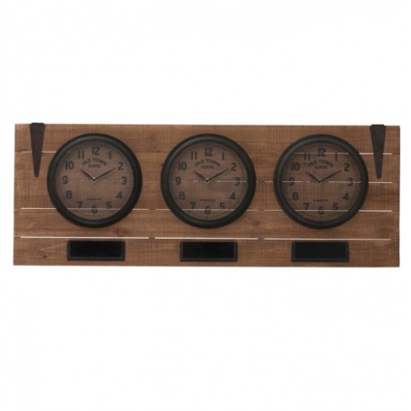 Zegar loft, dzięki trzem tradycyjnym cyferblatom może odmierzać czas w trzech, różnych miejscach na świecie. Zegar został wykonany z brązowych desek, na których zamontowano trzy okrągłe, czarne ramy. Potrójny zegar posiada także pod każdą z tarcz tabliczkę, w której możesz umieścić własny opis dla każdego z pojednyczych zegarów. Zegary ścienne w loftowym stylu to pomysł na stylowe wnętrze.