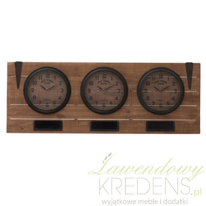 Potrójny zegar ścienny na drewnianych deskach to designerska ozdoba ściany w loftowym stylu.