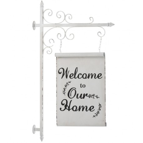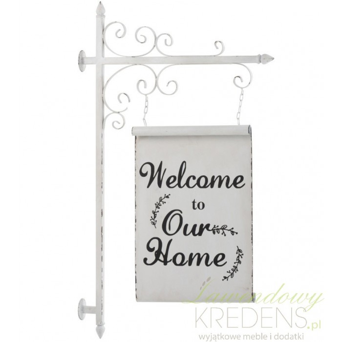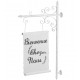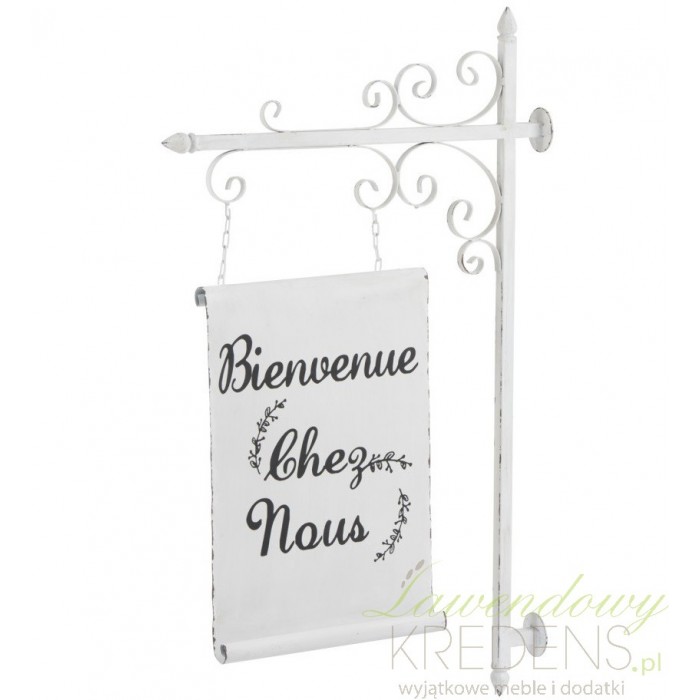 Szyld dwustronny z francuskimi i angielskimi napisami powitalnymi na białej tabliczce z postarzeniami.