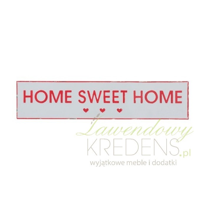 Postarzana tablica metalowa z napisem Home Sweet Home i trzema serduszkami w kolorze wyrazistej czerwieni to dodatek do domu od Home Decorations.