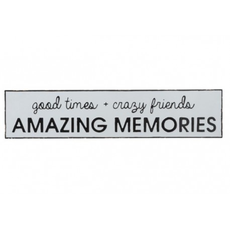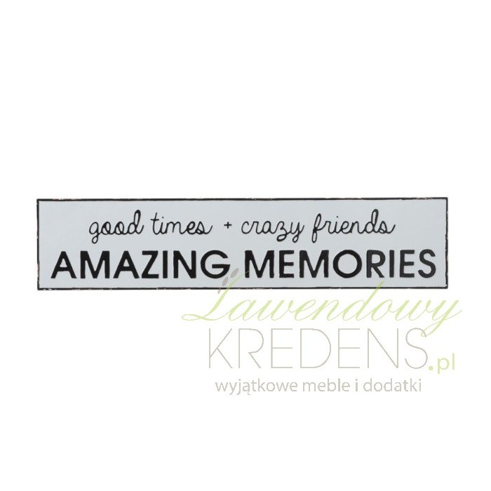 Metalowa tablica została zaprojektowana w stylu retro. Tablica jest biała i ma ciekawą krzyżówkę w języku angielskim: good times + crazy friends AMAZING MEMORIES. Dzięki temu będzie świetnym pomysłem na prezent dla bliskiej osoby, z którą takie słowa odrazu nam się kojarzą. Dodatki w stylu retro a w nich tablica metalowa to kolejne rozwiązanie by stworzyć wyjątkową i niepowtarzalną aranżacje!