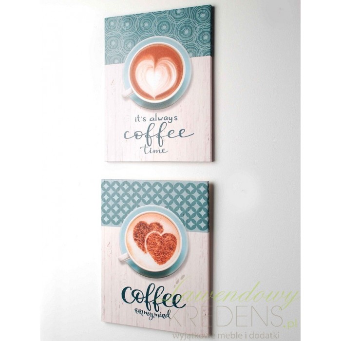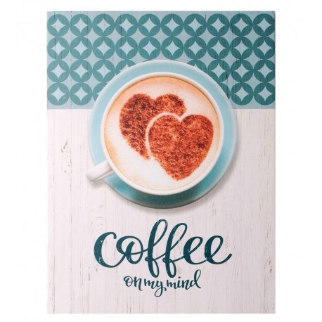 Obraz z kawą wykonany w stylu retro na płótnie na drewnianym stelarzu. Obraz w stylu retro to ozdoba idelana dla każdego wielbiciela kawy. Obraz przedstawia filiżankę kawy, na szczycie której można dostrzec piankę opruszoną posypką w kształcie dwóch złączonych serc. Ciekawym dodatkiem do całej dekoracji jest napis w dolnej części- Coffe on my mind!