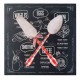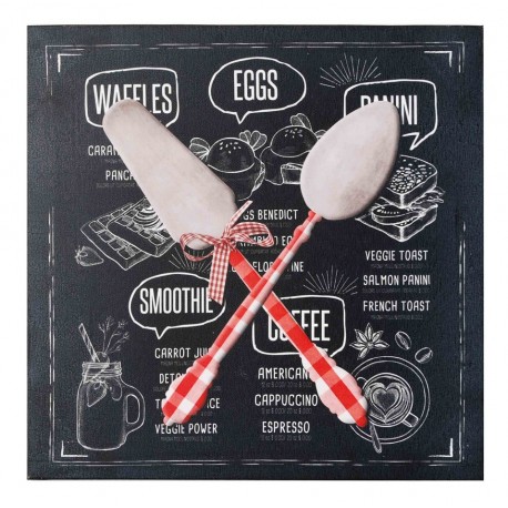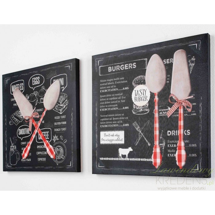 Obrazek retro to realizacja ciekawego pomysłu holenderskiej firmy. Obrazek jest namalowany na płótnie na drewnianych stelarzu i przedstawia menu oraz skrzyżowaną łopatkę do ciasta i łyżkę. Obrazek z czarnym tłem i białym menu będzie ciekawą dekoracją w niejednym barze lub restauracji. Obrazki do kuchni takie jak obrazki retro to świetne rozwiązanie na ozdobienie wnętrza!