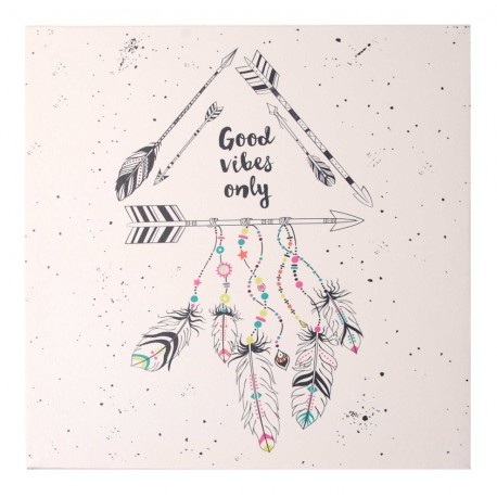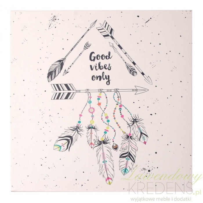 Łapacz snów to amulet, który od wieków kojarzy się jako znak przynoszący szczęście i mający zapewnić spokojną noc. Dlatego tak często wykorzystywany jest w dekoracjach do pokoju dziecięcego. Obraz z piórami wykorzystuje ten motyw. Wykonany jest na płótnie na drewnianym stelarzu. Jest w pastelowych barwach i ma napis Good vibes only. To wszystko sprawia, że przyjemnie się na niego patrzy.