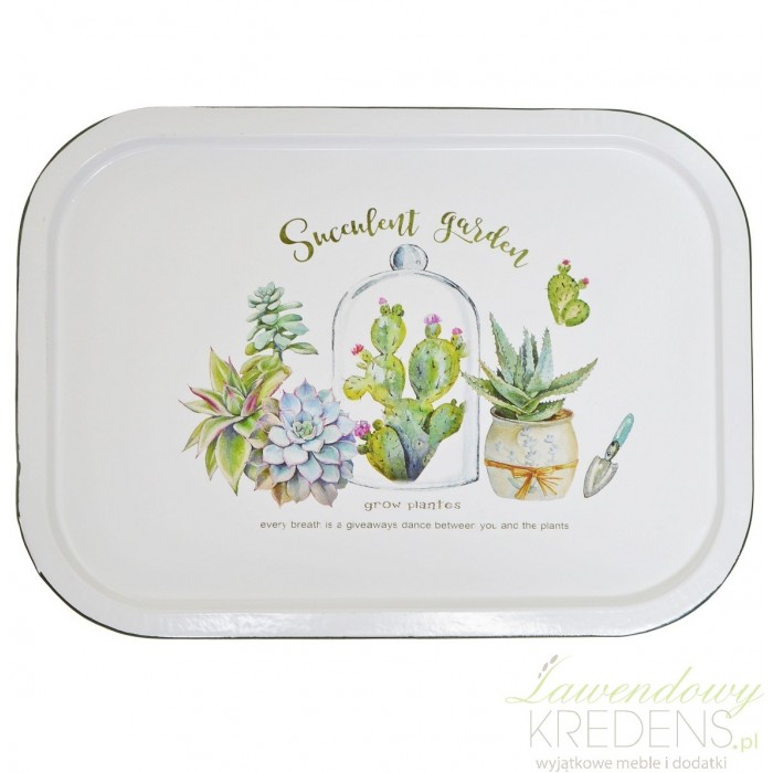 Dodatki do domu o ciekawym designie potrafią zaspokoić nawet najbardziej wyrafinowane gusta. Metalowa taca po pierwsze jest niezwykle trwała, a po drugie wyróżnia się na tle innych akcesoriów niezwykle ciekawym wzorem z zielonymi kaktusami. Biała taca ma zaokrąglone krawędzie zaznaczone ciemnym kolorem i lekko przetarte. Nie czekaj dłużej, dodaj ją do koszyka właśnie teraz!