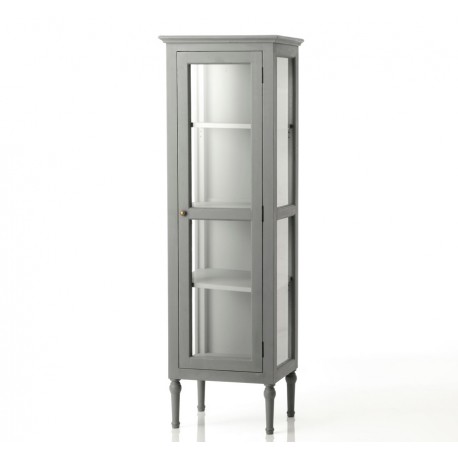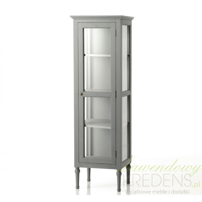 Witryna prowansalska została wykonana z drewna w kolorze szarym. Dzięki prostocie wykonania i stonowanej kolorystyce będzie doskonale pasowała zarówno do monochromatycznych wnętrz jak i nieco bardziej zróżnicowanych kolorystycznie. Wewnątrz witryna w stylu prowansalskim ma trzy półki, których zawartość jest doskonale widoczna dzięki przeszklonym drzwiom i ścianom. Szare, prowansalskie meble to świetny sposób na atrakcyjne wnętrze.