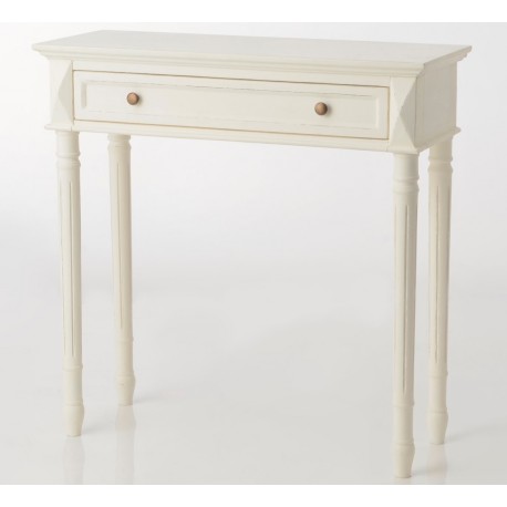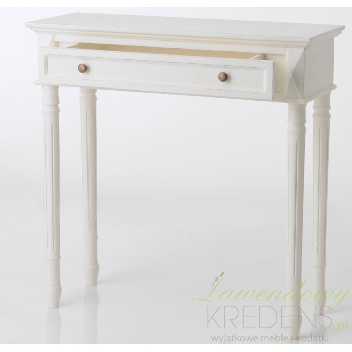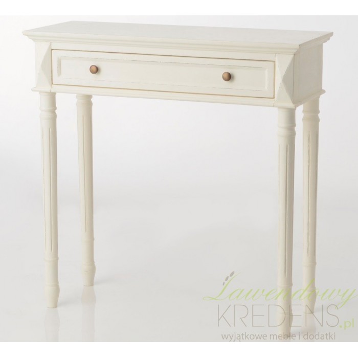 Prosta konsola prowansalska robi wrażenie dzięki prostocie wykonania i delikatnemu, kremowemu wybarwieniu drewnianej konstrukcji.
