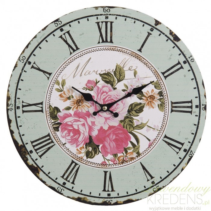 Zegar w stylu prowansalskim zdobiony kwiatami i postarzeniami podkreśli piękno każdego wnętrza.