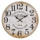 Zegar retro jest okrągły i ciekawe postarzony. Zdobią go napisy i przebarwienia.