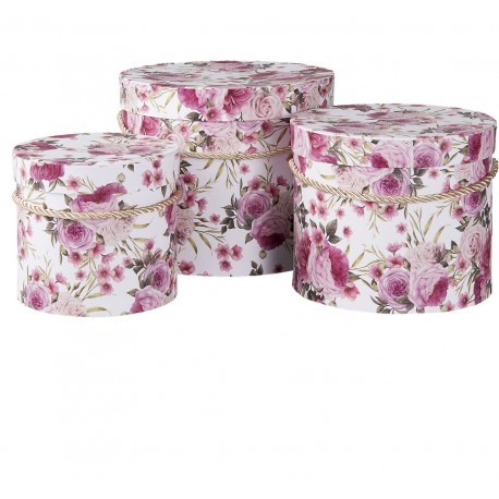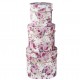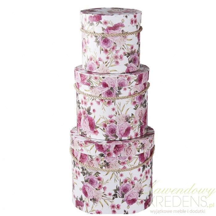 Trzy pudełka ozdobne w różnych rozmiarach z jednakową grafiką z różowymi kwiatami na jasnym tle.