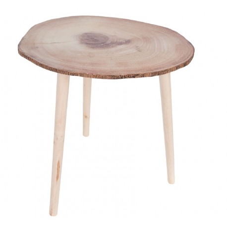 Stolik kawowy w jasnym kolorze brązu ma blat wyglądający jak plaster dużego drzewa. Blat w kształcie zbliżonym do okręgu ma przykręcone trzy proste nogi. Wykorzystaj w nowoczesnym salonie lub efektownie zestaw z innymi meblami prowansalskimi. Pokochaliśmy stoliki kawowe Clayre&Eef nie tylko za jakość wykonania ale też za przepiękny wygląd!