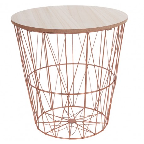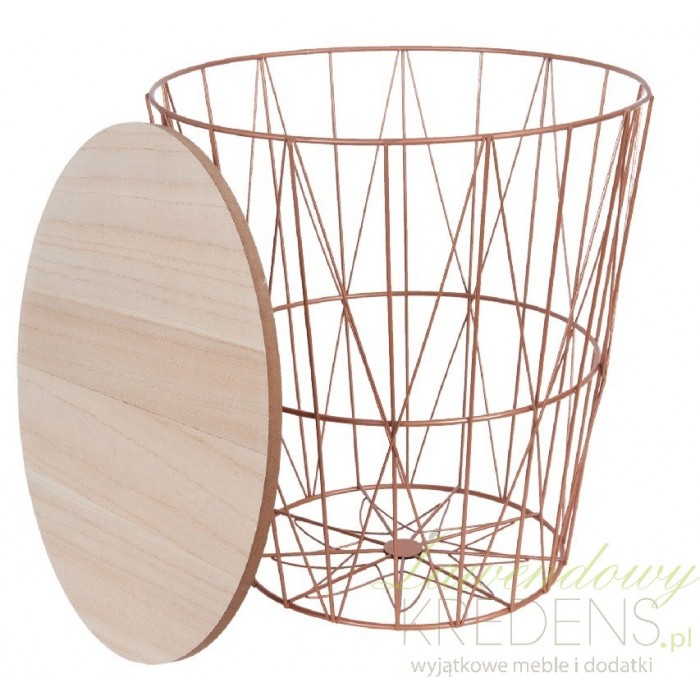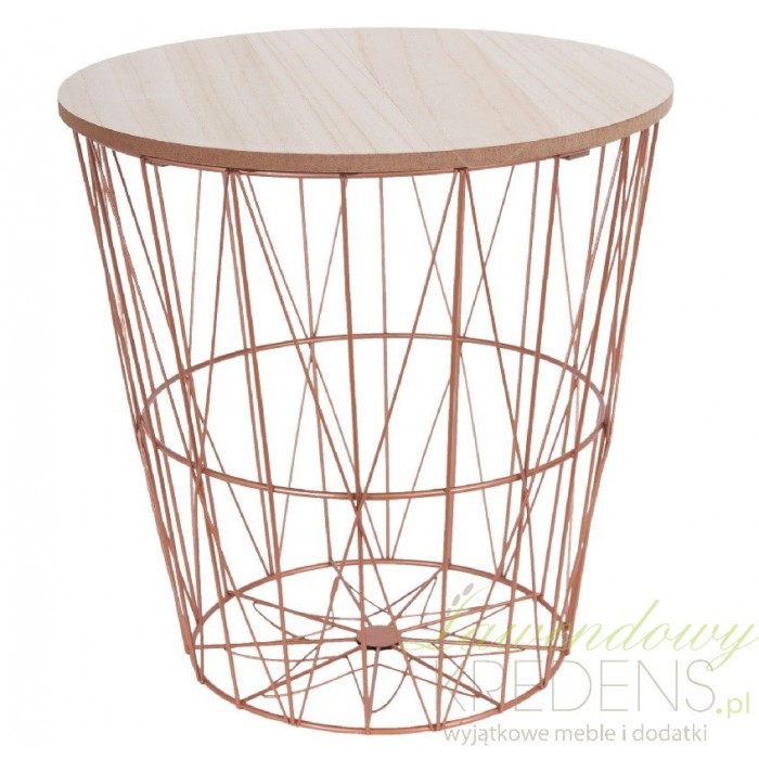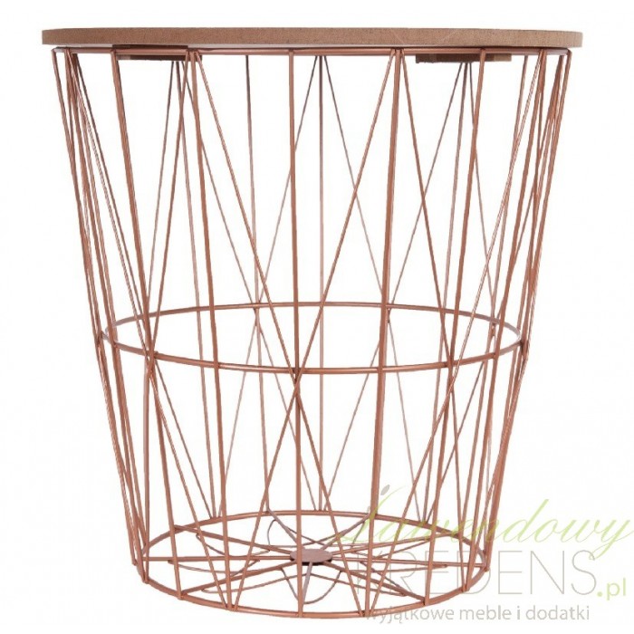 Fantastyczny stolik miedziany jest wykonany z metalu o ażurowej strukturze niczym metalowy kosz.