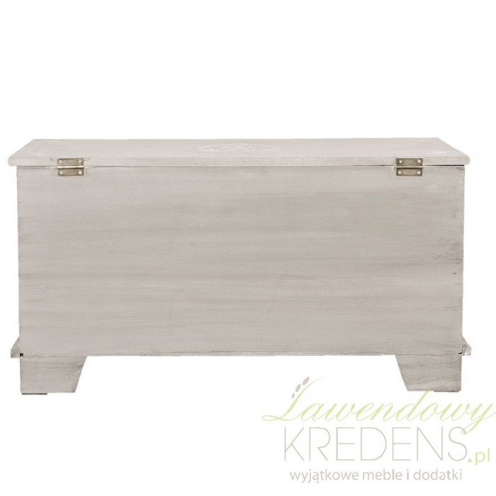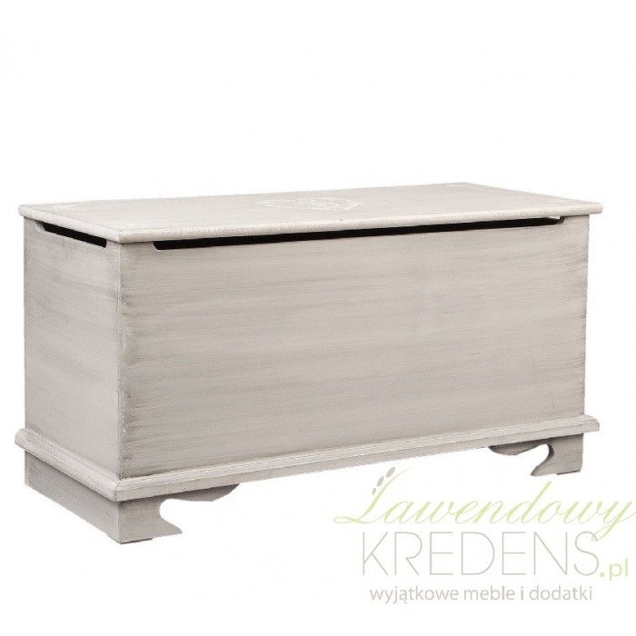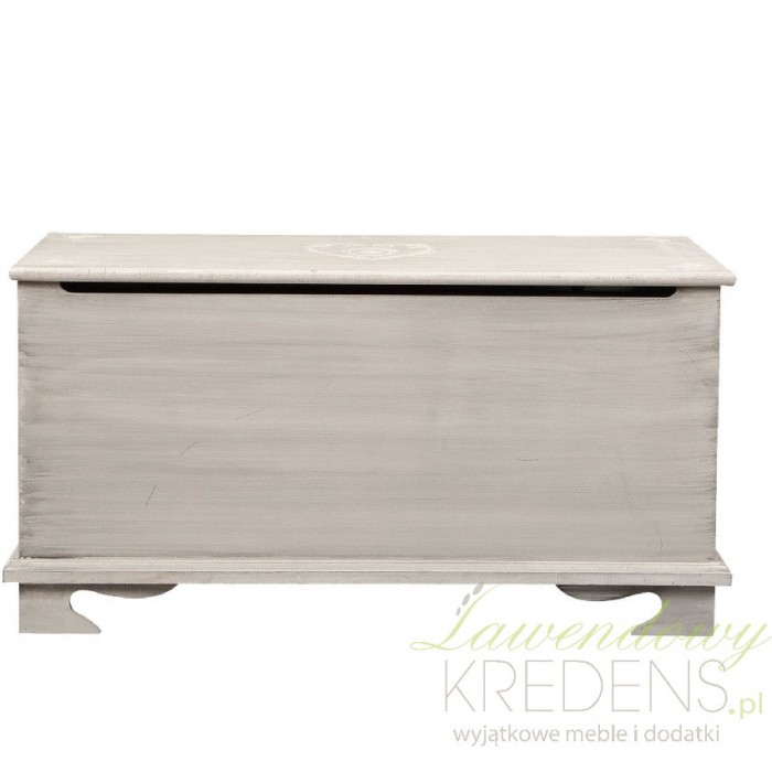 Skrzynia prowansalska w kolorze szarym ma delikatne smugi na powierzchni, które perfekcyjnie podkreślają jej prowansalski styl.