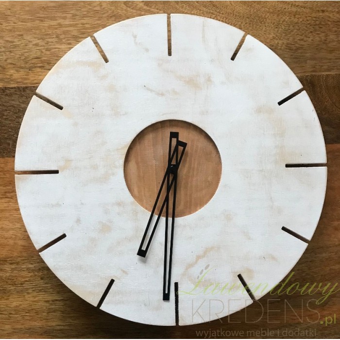 Okrągły zegar ścienny z wycięciami wokół, które zastępują tradycyjne cyfry.