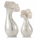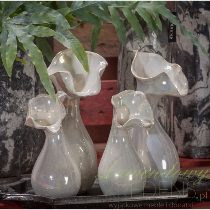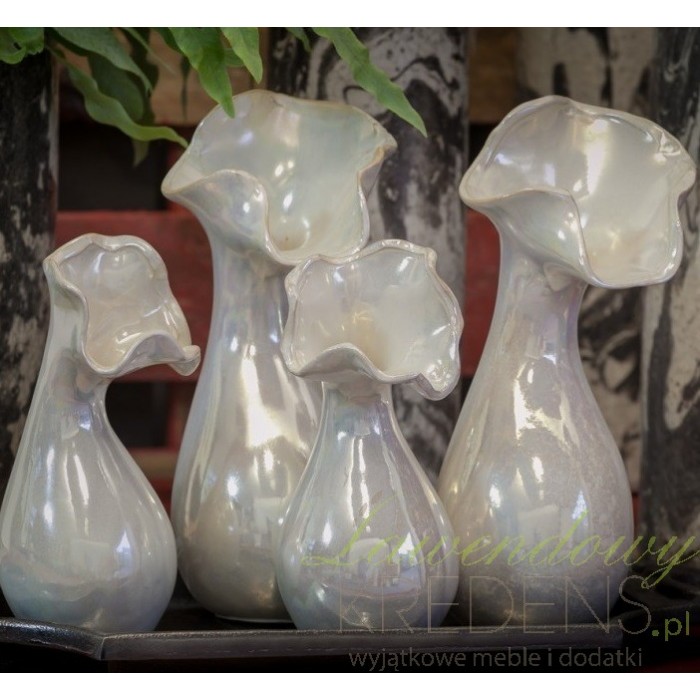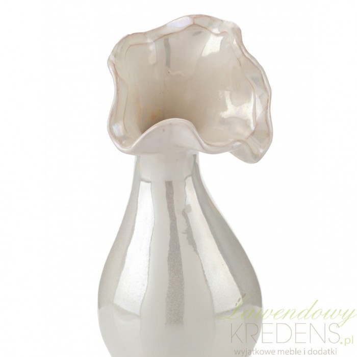Wazon ozdobny od Aluro ma jasny, delikatnie perłowy kolor i wygląda jak wykonany ze szkła.