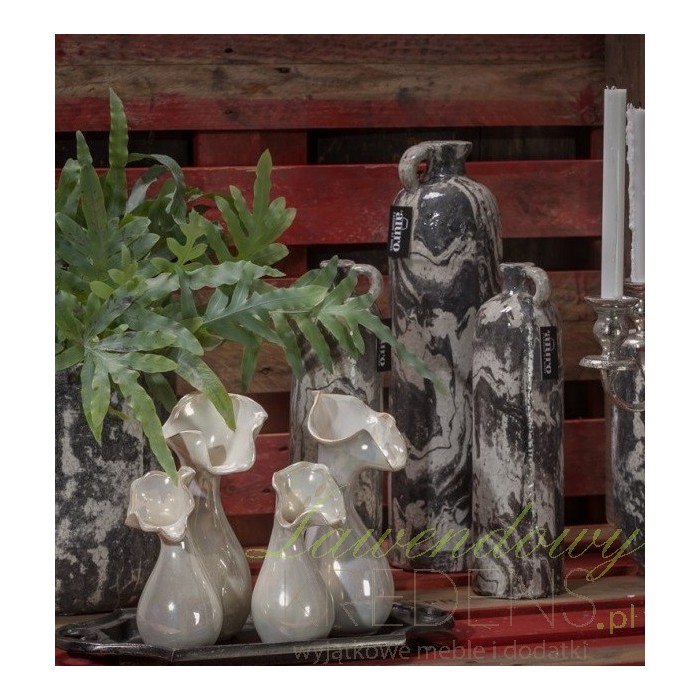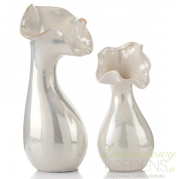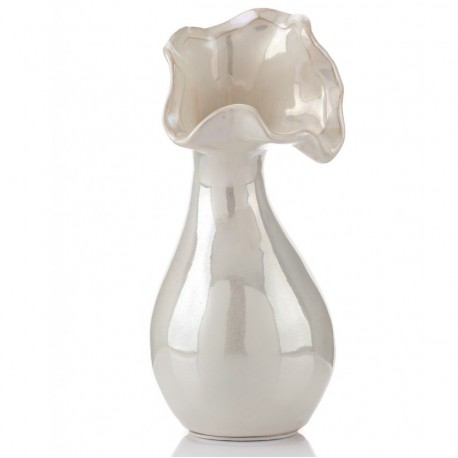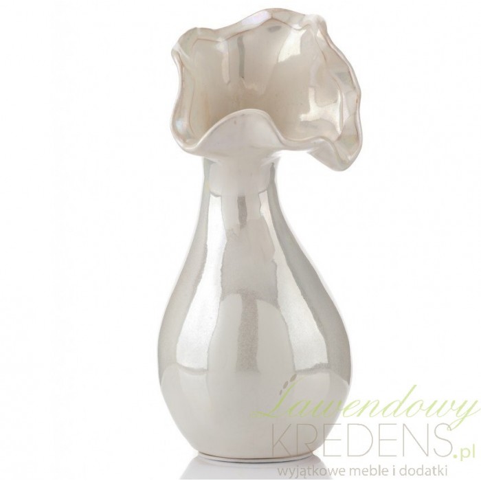 Ceramiczny wazon ozdobny charakteryzuje ciekawy kształt. Ujście wazon jest wyrzeźbione w kształcie rozłożystego kwiatu i ma smukłe zwężenie tuż pod nim. Jasny wazonik niewielkich rozmiarów to detal, który rozświetli swoim blaskiem każde wnętrze. Artykuły dekoracyjne z możliwościami praktycznego wykorzystania są na wagę złota.