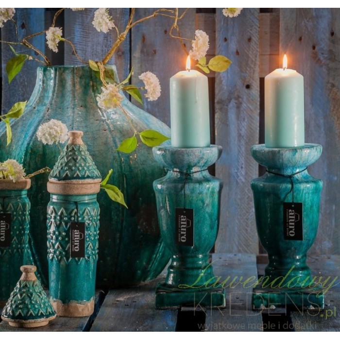 Świecznik Aluro jest wykonany z ceramiki i uformowany jako masywna noga z miejscem na świecę. Świecznik ma fantastyczny kolor turkusu, dzięki któremu prezentuje się jakby był zamarznięty. Na tym świeczniku możesz ustawić małe i duże świece. Polecamy artykuły dekoracyjne od Aluro, tworzące nastrojowe wnętrza.