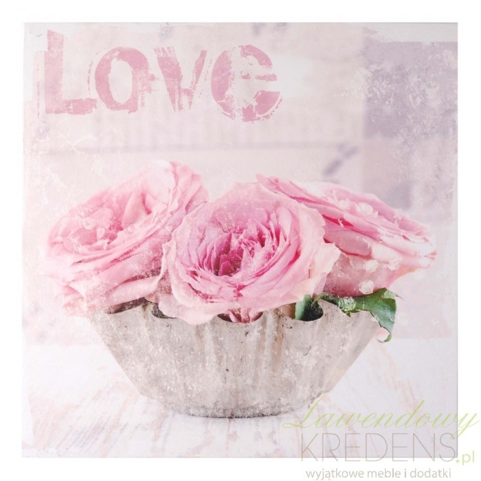 Obraz z różami na płótnie ma kształt kwadratu i pastelowe kolory. Obraz Prowansja przedstawia bukiet róż w niskiej donicy, przecierane tło i różowy napis LOVE. Odkryj tajemnicę tworzenia stylowych aranżacji dzięki kolekcji obrazów Prowansja. Obrazy prowansalskie to dekoracje, które wzbogacą wizualnie każde pomieszczenie utrzymane w francuskim czy retro tonie.