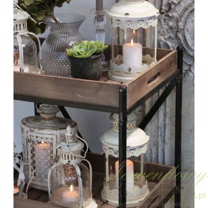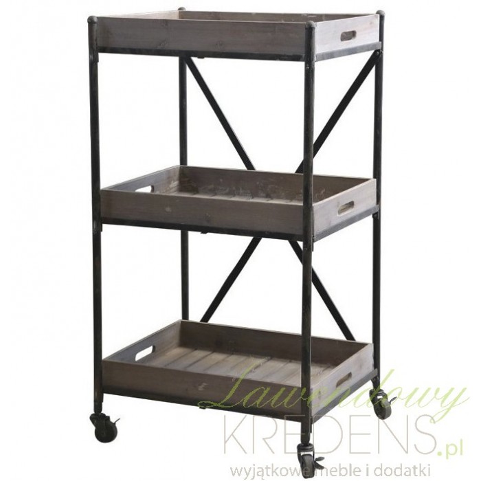 Szafka Chic Antique to mobilny mebel posiadający cztery kółka, który doskonale nadaje się do przedpokoju lub do pomieszczenia gospodarczego. Szafka na kółkach ma metalowy, stabilny stelaż. Półki na trzech poziomach to niskie skrzyneczki z otworami po bokach, wykonane z drewna. Takie meble loftowe to zdecydowany lider praktyczności.